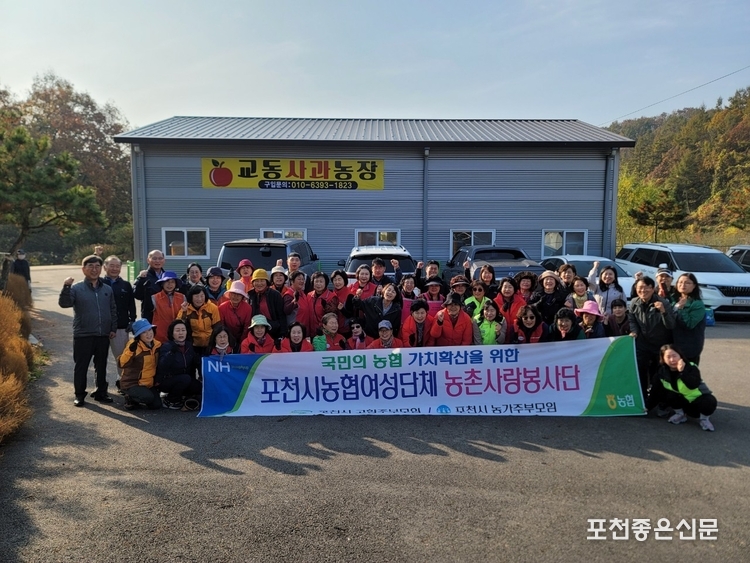 농협중앙회 포천시지부(지부장 박윤경)는 10월 30일 포천시고향주부모임(회장 송태숙)회원, 포천시농가주부모임(회장 박민영)회원, 관인농협 김경식 조합장과 임직원, 그리고 포천시 관내 지역농협 여성복지 담당자 및 농협은행 포천시지부 직원 등 70여 명과 함께 관인농협 관내의 한 사과 농가를 찾아 일손 돕기에 구슬땀을 흘렸다.