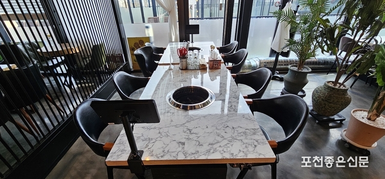 식당의 모든 테이블에는 요즘 트렌드에 맞게 주문할 수 있는 키오스크가 있다. 약간 늦은 시간이라 고기 메뉴 중에 단품 메뉴 몇몇은 품절로 나온다. 본관 안쪽에는 멋지게 꾸며 놓은 방도 2개가 준비되어 있었다. 본관 테이블에 빈 곳이 있어서 홀 테이블 중 하나에 착석했다. 키오스크 옆에는 맥주컵, 소주잔, 소스들, 물, 티슈 등이 준비되어 있었다.