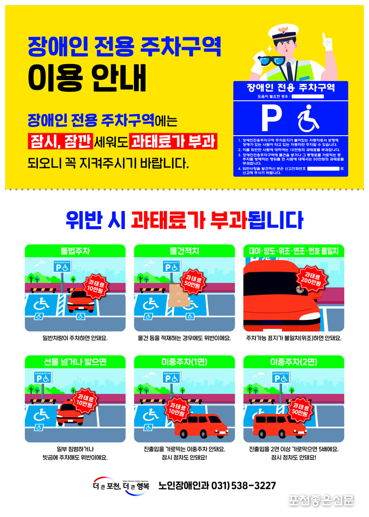 포천시는 지난 4월 24일 장애인전용주차구역 상습 위반 지역인 청계천 복개 공영주차장, 송우로 제1, 2 공영주차장 등에서 주차 위반 행위 금지에 대한 집중 홍보활동을 실시했다.