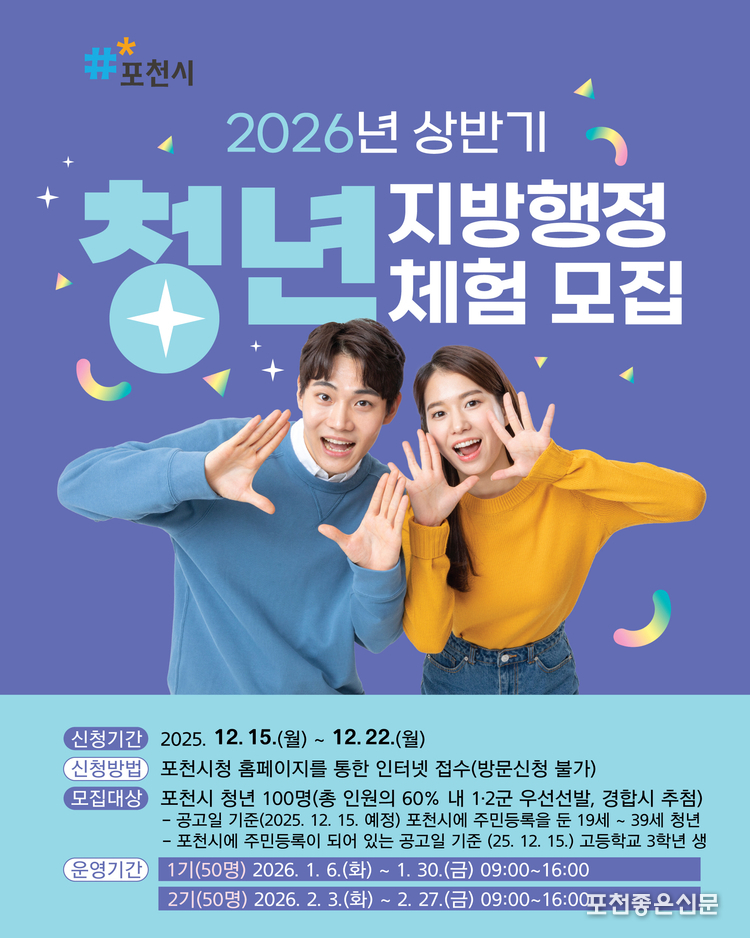 포천시는 오는 12월 22일까지 ‘2026년 상반기 청년 지방행정체험’ 참여자 총 100명을 모집한다.