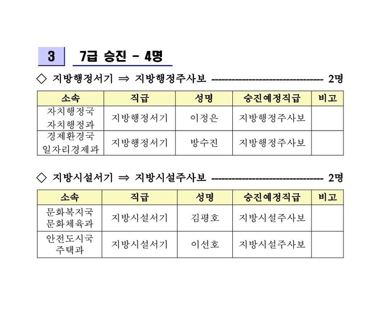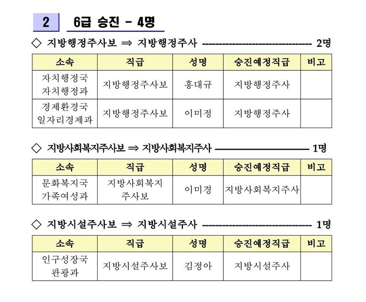4급 승진자 3명, 6급 승진자 4명, 7급 승진자 4명, 8급 승진자 6명 등 총 17명에 대한 승진 인사를 단행했다.