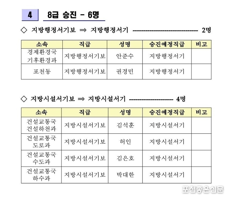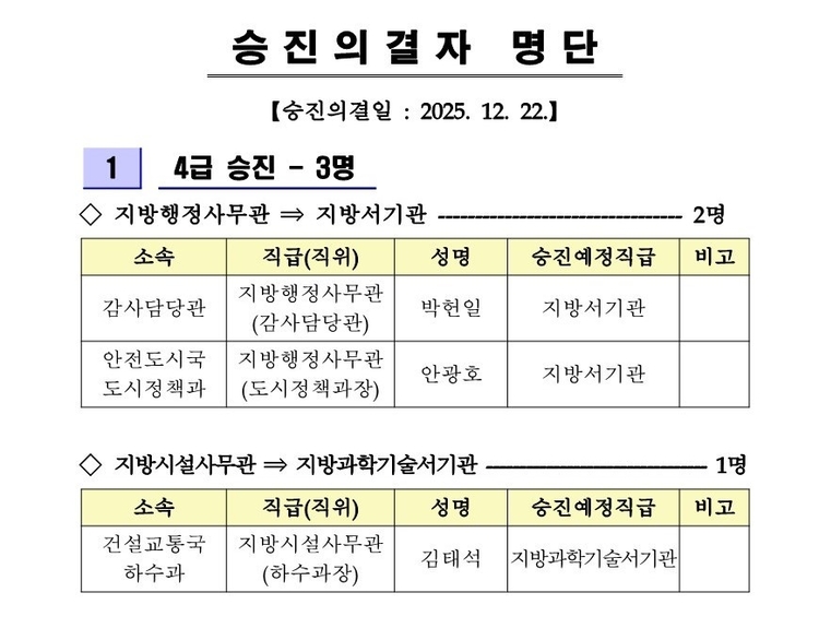 포천시는 2025년 12월 12일자 승진 의결자를 발표했다.