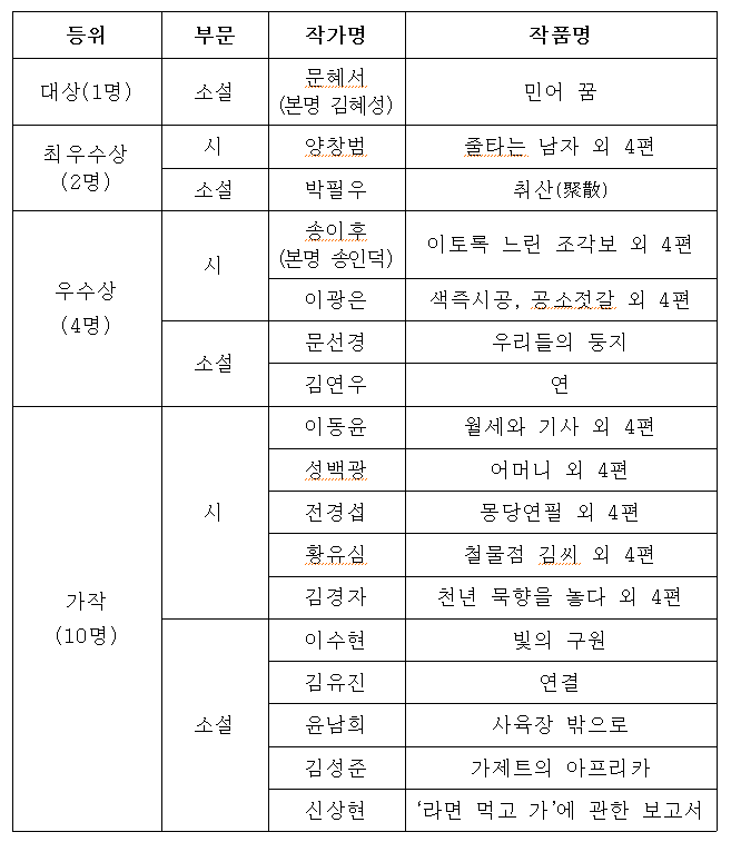 문혜서 수상자는 수상소감에서 “소설을 쓰면서도 ‘이 글은 공모전에 출품하기엔 너무 잔혹한 이야기다’라고 생각했었습니다. 그러나 내가 진정으로 쓰고 싶은 이야기를 써야 남들에게도 와닿는 이야기가 될 것이라는 고지식함으로 소설의 완결까지 달렸습니다”라고 했다.