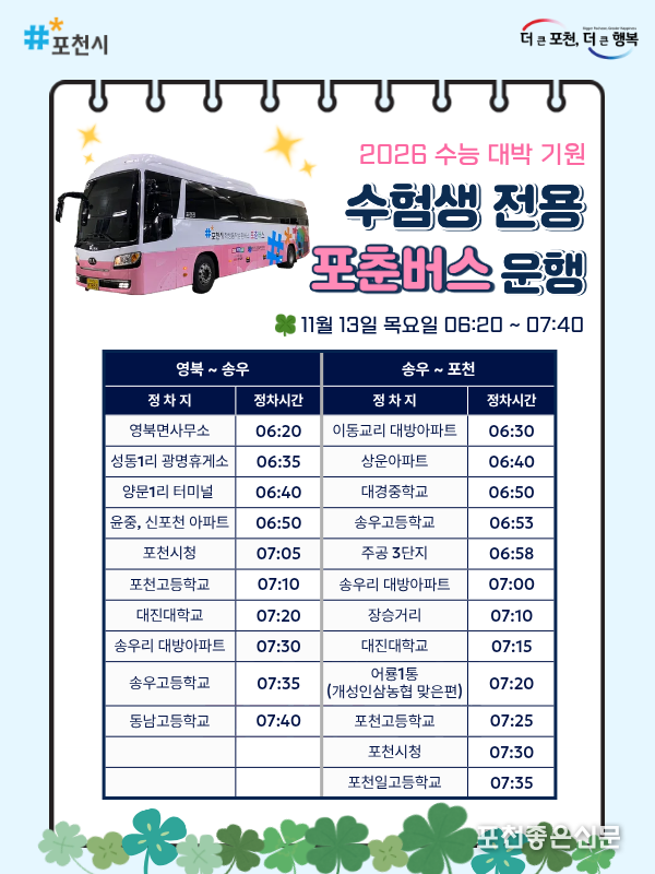 또한, 시험장 인근에는 포천시 모범운전자회가 배치되어 교통을 관리하며, 불법 주정차 집중 단속도 함께 실시된다. 특히 '수험생 전용 포춘버스' 2개 노선(영북~송우, 송우~포천)을 운행하여 수험생들의 이동 편의를 도울 계획이다.