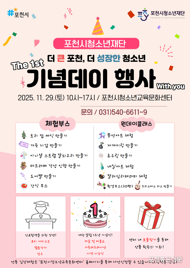 포천시청소년재단은 재단 출범 1주년을 맞아 오는 11월 29일 포천시청소년교육문화센터에서 ‘2025년 포천시청소년재단 1주년 기념행사 – 더 큰 포천, 더 성장한 청소년’을 개최한다.
