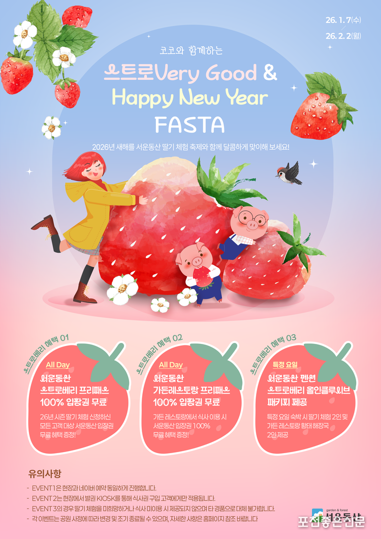 포천시 겨울 산책의 명소이자 힐링하기 좋은 친자연 생태학습 정원인 서운동산(대표이사 : 이해연)이 2026년 새해를 맞아 ‘코코와 함께하는 스트로 베리굿 & 해피 뉴이어 페스타' 프로모션을 진행한다.