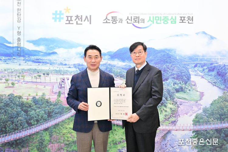 지정서에는 '위치 : 포천시 군내면 용정리 192-1, 명칭 : 윤세징 일가 묘역 및 석물, 수량 : 봉분 3기, 석물 18건 26점, 지정일 : 2026년 2월 24일'이라고 적혀 있고, '위 윤세징 일가 묘역 및 석물을 향토 유산 제57호로 지정합니다'라고 명기되어 있다.