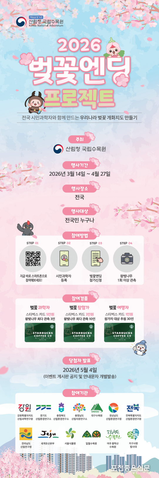 산림청 국립수목원(원장 임영석)은 2026년 봄 벚나무 개화 시기에 맞춰 시민과학 참여 프로그램인 「벚꽃엔딩 프로젝트」를 운영한다고 3월 12일 밝혔다.