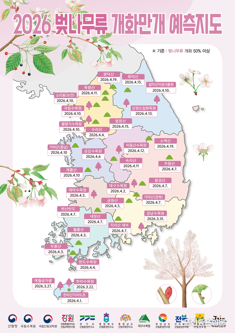 이번 프로젝트는 참여 방식을 확대해 전국 어디에서나 참여할 수 있도록 했다. 참여자는 스마트폰으로 '모바일 식물계절관측 웹서비스(knpn.kr)'에 접속한 뒤, 주변 벚나무의 개화 모습을 촬영해 업로드하면 된다. 벚나무 개화 시기는 지역에 따라 차이가 있으므로, 산림청이 지난 2월 24일 발표한 ‘2026 봄꽃 만개 예측지도’를 참고하면 지역별 예상 만개 시기를 확인할 수 있다.