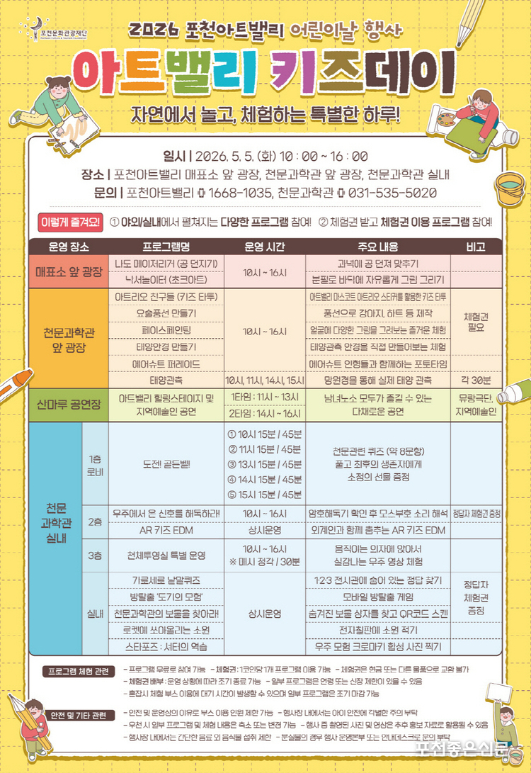 이번 행사는 자연과 예술이 어우러진 포천아트밸리의 공간적 특성을 살려 어린이들에게 다양한 체험 기회를 제공하고, 가족 단위 방문객에게 즐거운 추억을 선사하기 위해 마련됐다.
