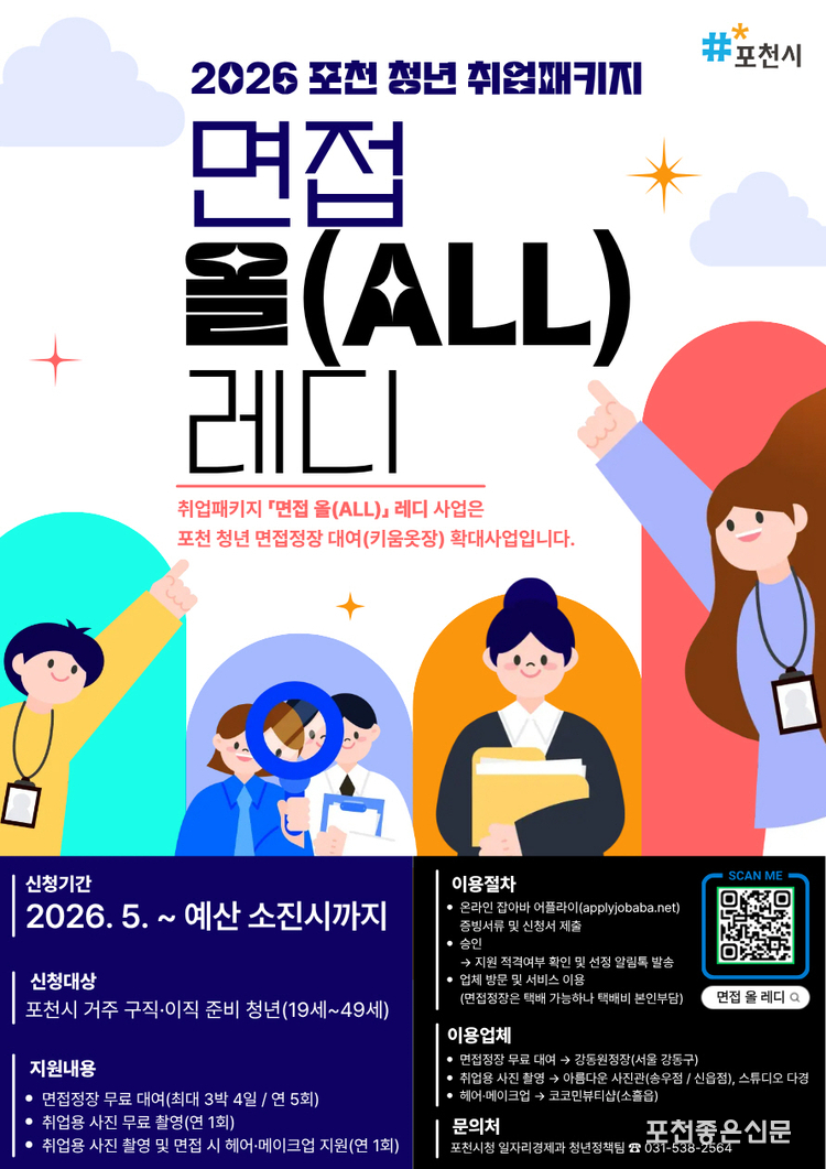 포천시는 구직 및 이직을 준비하는 청년들의 취업 준비 부담을 낮추고 취업 경쟁력을 높이기 위해 오는 5월 2일부터 2026 포천 청년 취업패키지 ‘면접 올(ALL) 레디’ 사업을 운영한다고 4월 29일 밝혔다.