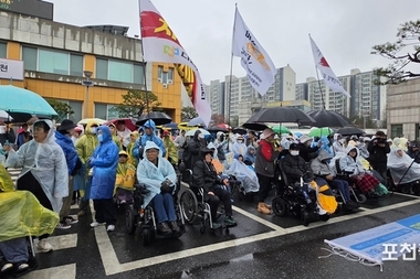 4월 10일 오전 소흘읍 행정복지센터 앞 주차장에는 비가 부슬부슬내리는 중에도 약 200여명의 장애인들이 모였다. 올해로 14회를 맞이하는 장애인 이동권 보장을 위한 행진인 '두 바퀴로 가는 세상' 도보 행진(이하 행진)의 발대식에 참여하기 위해서이다. 이 행사는 소흘읍행정복지센터에서 포천시청까지의 약 11.5km를 장애인들이 걸어서 이동하는 대회인데, 장애인의 이동권 및 보편적 권리 획득을 주장하기 위한 대회이다. 금년의 행진은 '포천나눔의집 장애인자립생활센터(센터장 이영봉)'가 주최하고 '포천시 420 장애인 권익옹호 연대'가 주관하였으며, 이 자리에는 백영현 시장, 포천시의회 의장, 김효진 포천도시공사 사장 등이 함께 하였다. 행진은 발대식 후에 선단동 이마트까지 가는 여정이 1구간으로 정오까지 도착하도록 예정되어 있다. 이후 중식과 휴식 후 이마트에서 포천시청까지의 2, 3 구간을 오후 5시까지 행진한다. 이후 시청 광장에서 해단식을 하면서 행진을 마치게 된다. 백영현 시장은 "매해 행진에 적극적으로 참여하여 우리 사회에 공감과 배려를 확산하는데 앞장서 오신 여러분께 깊은 경의를 표한다. 덕분에 포천시는 더욱 포용적이고, 함께 어울려 살기 좋은 도시가 되어 가고 있다. 휠체어도 자전거도 두 바퀴가 함께 있기에 앞으로 갈 수 있듯이, 우리 시도 장애인과 비장애인이 서로 존중하고 이해하는 마음으로 함께 성장해 나가기를 바란다"고 인사했다. 장애인 단체 대표들은 "지금은 비가 오지만, 지난해에는 상당히 무더웠다. 어떤 날씨나 어려움도 장애인의 권리를 찾기위한 우리의 행진을 막을 수는 없다. 함께 살아가는 좋은 세상을 위해 출발하자"고 말했다. 한편, '포천시 420 장애인 권익옹호 연대'에 소속된 단체들은 (사)경기장애인부모연대포천시지부(대표 김영순), 대한성공회 포천나눔의집(대표 오상운), 도담도담 부모회(대표 윤종년), 전국교직원노동조합 포천지회(대표 육기엽), 지역사회전환시설 라온(대표 임규설), 포천시민사회연대(대표 김영모 외 5명), 포천시수어통역센터(대표 송장섭), 포천시장애인가족지원센터(대표 이윤아), 포천나눔의집장애인자립생활센터(대표 이영봉) 등이다. [ 포천좋은신문 문석완 기자 ]