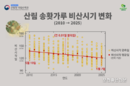 산림청 국립수목원(원장 임영석)은 소나무 화분(송홧가루) 비산 시기 변화를 분석한 결과, 기후변화의 영향으로 비산 시작 시점이 해마다 앞당겨지고 있는 것으로 나타났다고 4월 23일 밝혔다. 이번 분석은 국립수목원을 포함한 전국 11개 수목원이 참여하는 ‘한국 식물계절 관측 네트워크’의 자료를 기반으로 수행됐다. 소나무 관측목이 있는 전국 산림 24개 지점에서 장기간 축적된 자료를 활용하였다. 분석 결과, 2010년 이후 최근까지 소나무 화분 비산 시작일은 전국 평균 기준 매년 약 0.91일씩 앞당겨지고 있는 것으로 확인됐다. 특히 이러한 변화는 남부 권역에서 더욱 뚜렷하게 나타났으며, 지역 간 차이도 확인됐다. 이와 같은 결과는 기후변화에 따른 기온 상승이 식물의 생육 주기에 영향을 미치고 있음을 보여주는 사례로, 화분 비산 시기 역시 점차 앞당겨지고 있음을 시사한다. 송홧가루는 인체에 직접적인 독성은 없으나, 알레르기 체질이 있는 경우 재채기, 콧물, 눈 가려움 등의 증상을 유발할 수 있다. 특히 비산 시기가 앞당겨짐에 따라 기존보다 이른 시기부터 건강 관리에 주의가 필요하다. 국립수목원 임영석 원장은 “소나무 화분 비산 시기 변화는 기후변화가 생태계에 미치는 영향을 보여주는 중요한 지표이다. 앞으로도 전국 단위의 장기 식물계절 모니터링을 지속하고, 이를 바탕으로 국민 건강과 생태계 관리에 활용할 수 있는 정보를 제공해 나가겠다”고 밝혔다. [ 포천좋은신문 문석완 기자 ]