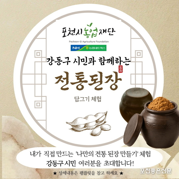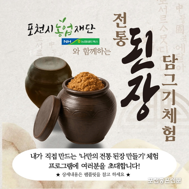 포천시농업재단은 “이번 된장 담그기 체험은 전통 식문화를 직접 만들고 기다리는 과정을 통해 그 가치를 체감할 수 있는 의미 있는 프로그램이다. 3회에 걸쳐 포천을 방문하며 지역을 보다 깊이 이해하고 친숙해지는 계기가 될 것으로 기대한다”고 밝혔다.
