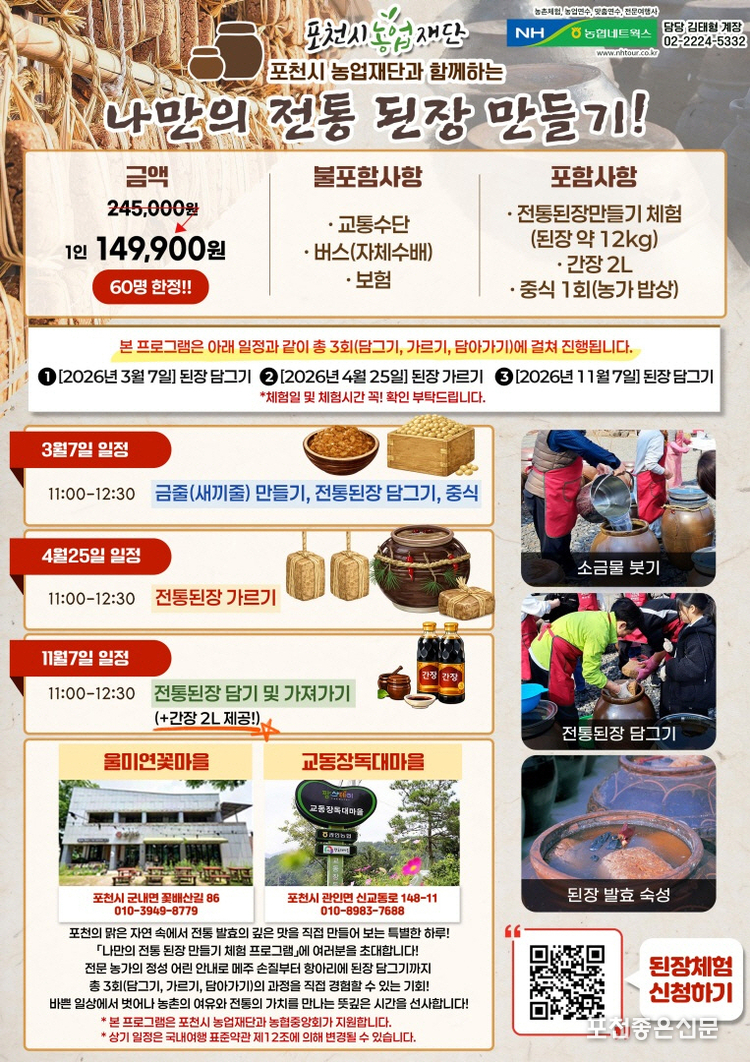 된장 담그기 체험 패키지와 관련한 자세한 사항은 포천시농업재단 공식 인스타그램 홍보 채널과 농협여행 누리집(https://www.nhtour.co.kr/nmall)을 통해 확인할 수 있다.