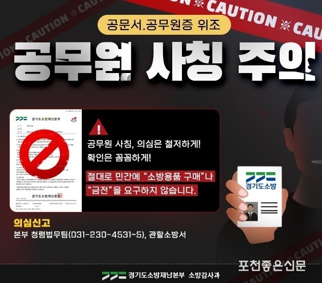 포천소방서 임경수 청문인권담당관은 “공공기관을 사칭한 범죄는 시민의 불안을 악용하는 행위”라며 “조금이라도 의심스러운 경우 즉시 소방서에 확인해 피해를 예방해 달라”고 말했다.