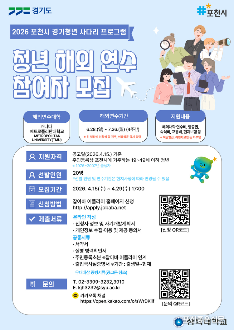신청은 잡아바 어플라이(https://apply.jobaba.net)를 통해 가능하며, 자세한 사항은 포천시청 홈페이지 ‘새소식’을 확인하거나 삼육대학교(☎ 02-3399-3233, 02-3399-3910, 카카오톡 채널 2026 포천경기청년 사다리)를 통해 문의하면 된다.