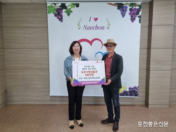 내촌면 소재 매봉기업인회(회장 김재봉)가 지난 10월 15일 내촌면 저소득 계층을 위해 농촌사랑상품권 200만 원 상당을 경기사회복지공동모금회에 기탁하며 ‘이웃사랑 나눔 릴레이 45호’에 동참했다고 밝혔다.