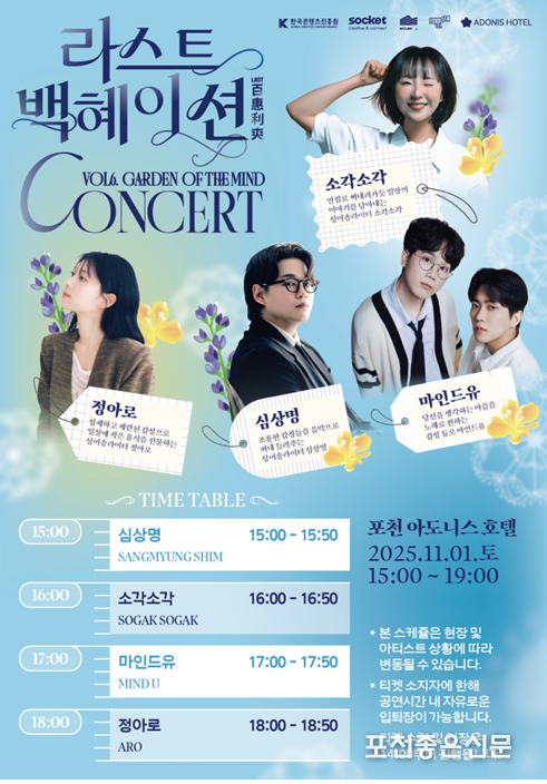 가을 단풍의 아름다운 정취 속에서 펼쳐질 이번 공연은 심상명, 소각소각, 마인드유, 정아로로 이어지는 감성 짙은 뮤지션들의 무대로 꾸며질 예정이다. 각기 다른 색을 지닌 아티스트들이 한자리에 모여, 관객들에게 음악과 휴식이 어우러진 특별한 ‘마지막 휴가’를 선사할 예정이다.