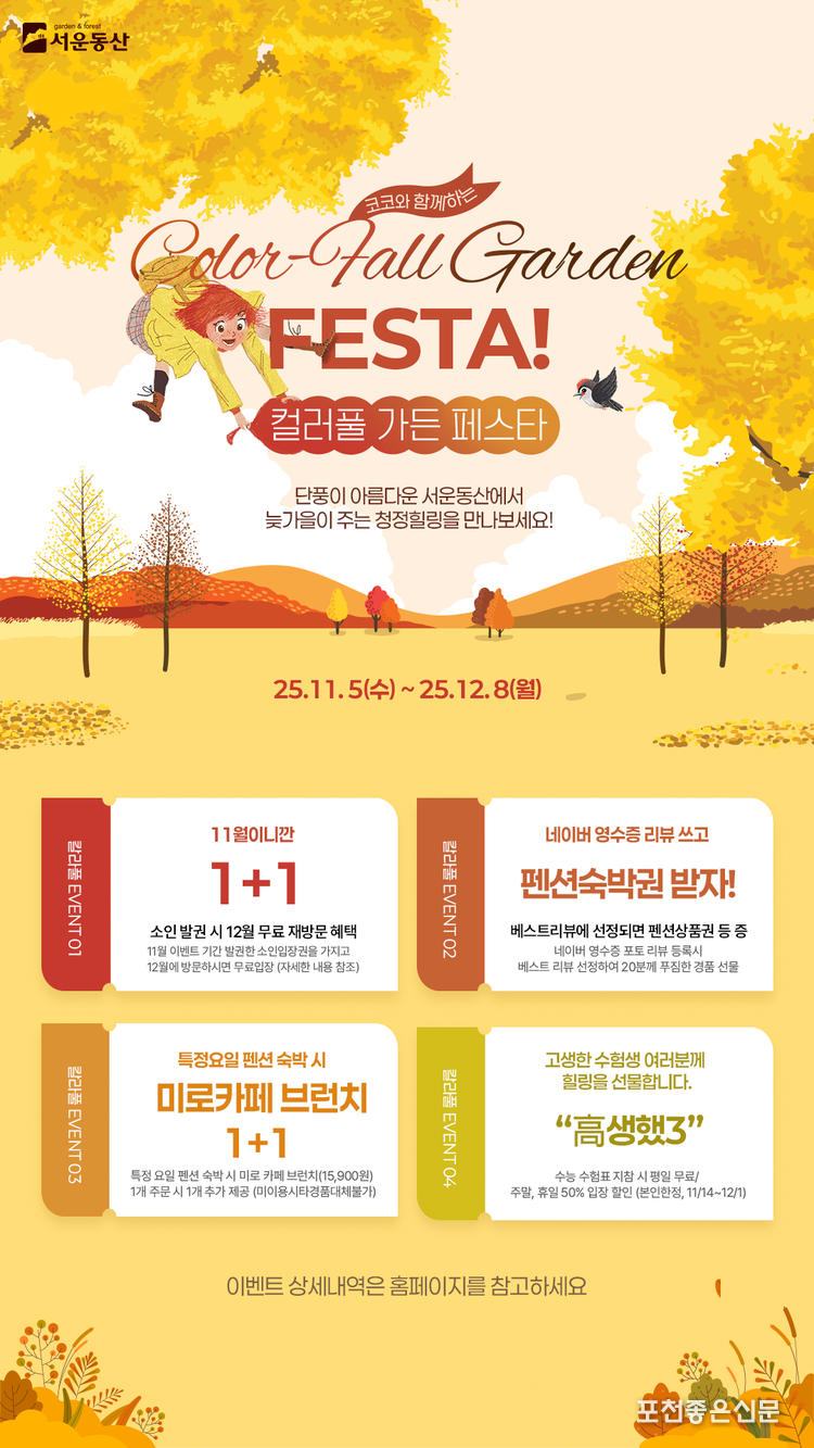 경기도 포천시 가을 대표 단풍 명소인 서운동산(대표이사: 이해연)이 2025년 마지막 가을 11월을 맞이하여 ‘코코와 함께하는 Color-Fall Garden 페스타' 프로모션을 진행한다.