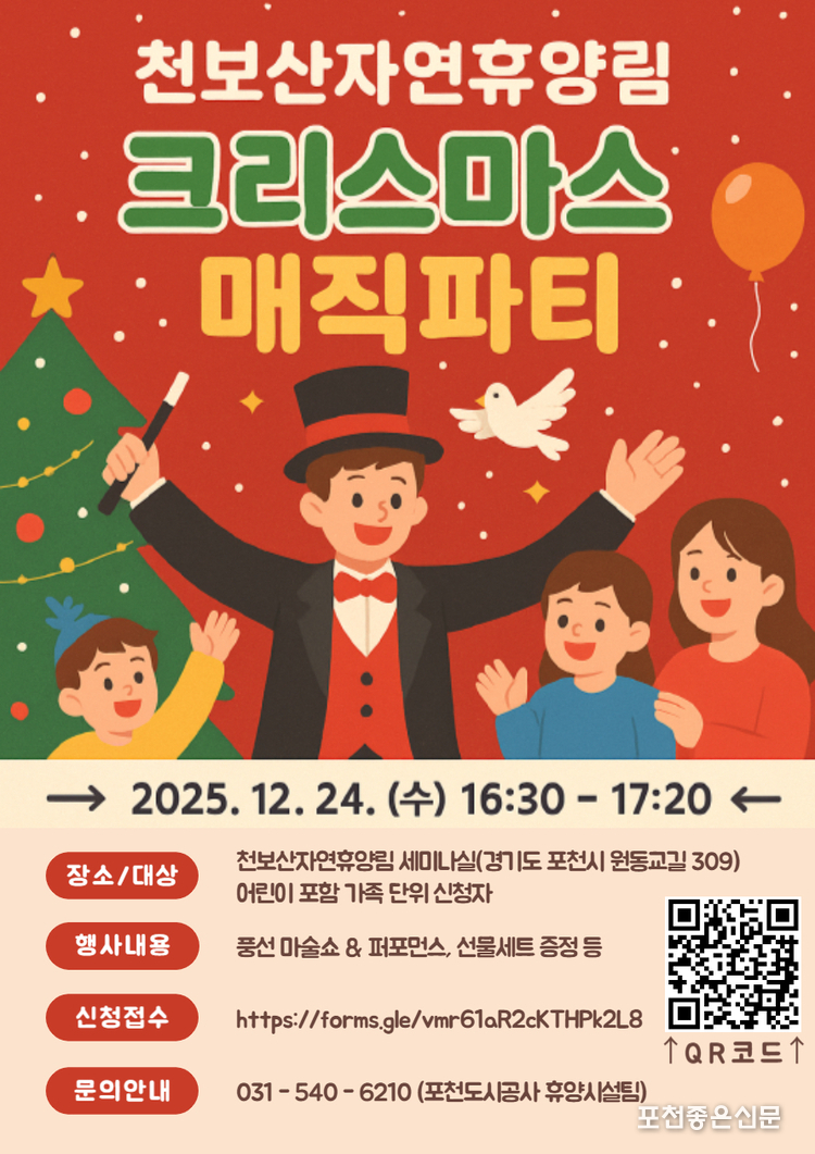 포천도시공사(사장 이상록)는 연말을 맞아 오는 2025년 12월 24일(수) 천보산자연휴양림 세미나실에서 가족 단위 이용객을 위한 특별 프로그램 ‘천보산자연휴양림 크리스마스 매직 파티’를 운영한다고 밝혔다.