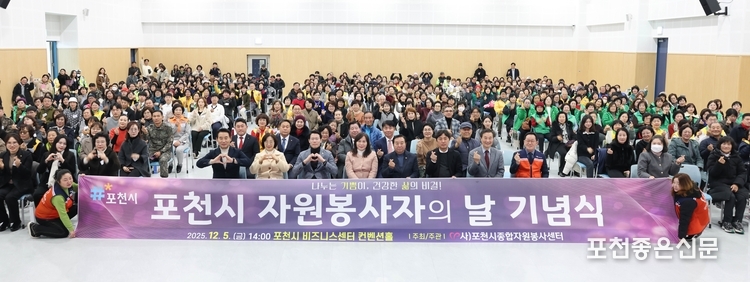 (사)포천시종합자원봉사센터는 12월 5일 포천시 비즈니스센터 컨벤션홀에서 「2025 포천시 자원봉사자의 날 기념식」을 열고, 한 해 동안 다양한 현장에서 헌신한 자원봉사자들의 노고를 격려하는 뜻깊은 시간을 마련했다.