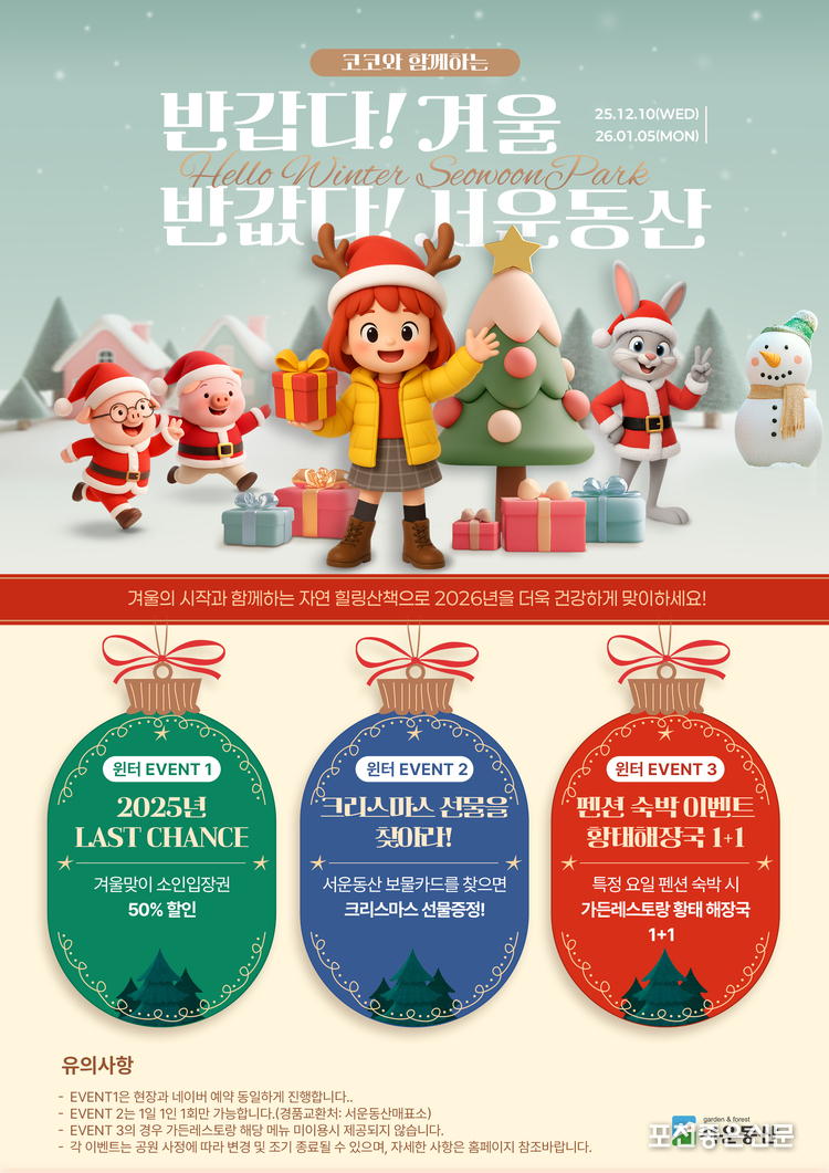 경기도 포천시 대표 겨울 산책 명소 서운동산(대표 이해연)이 2025년 마지막 달이자, 겨울의 시작인 12월을 맞이해 ‘코코와 함께하는 반갑다 겨울! 반값다 서운동산!' 프로모션을 진행한다.