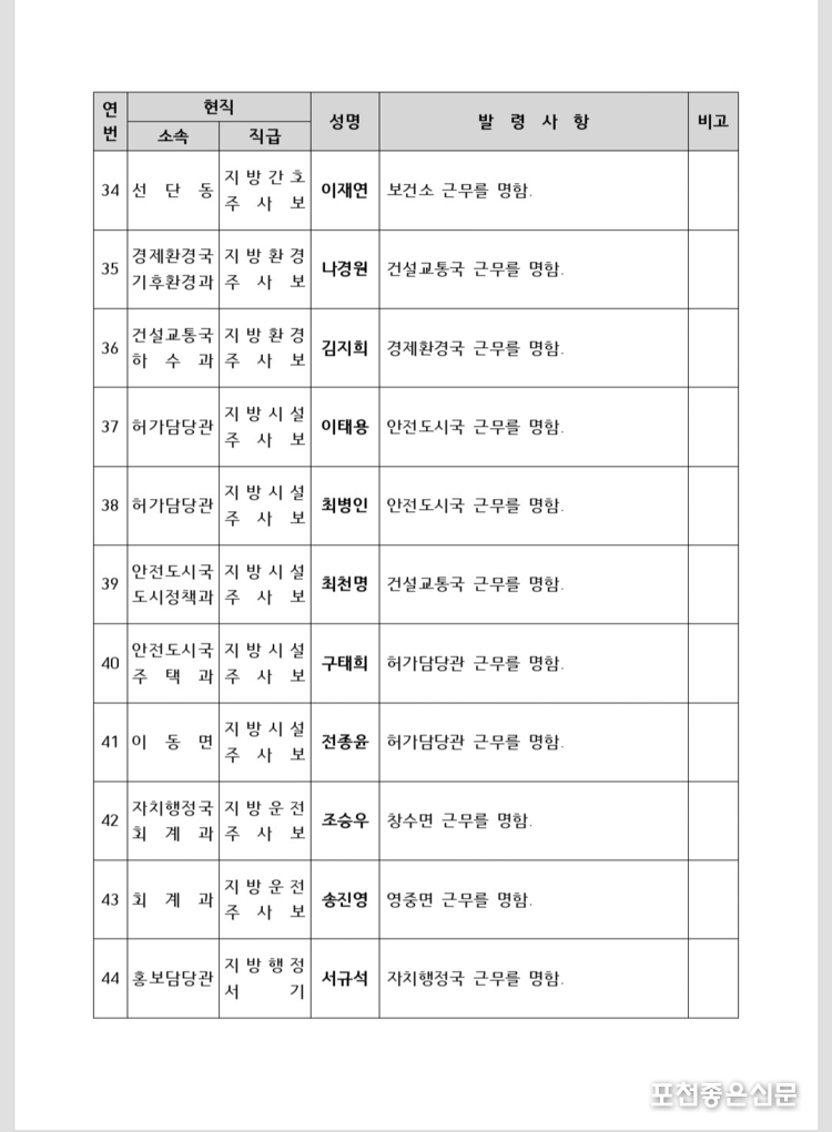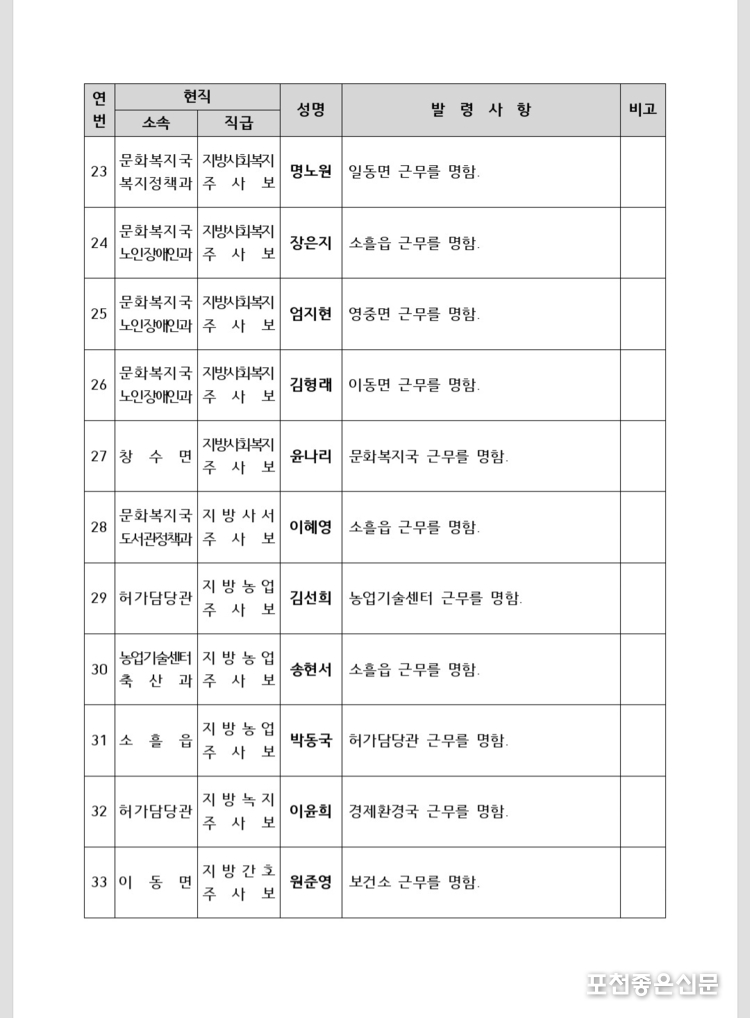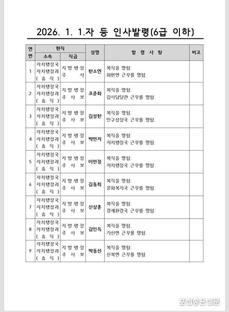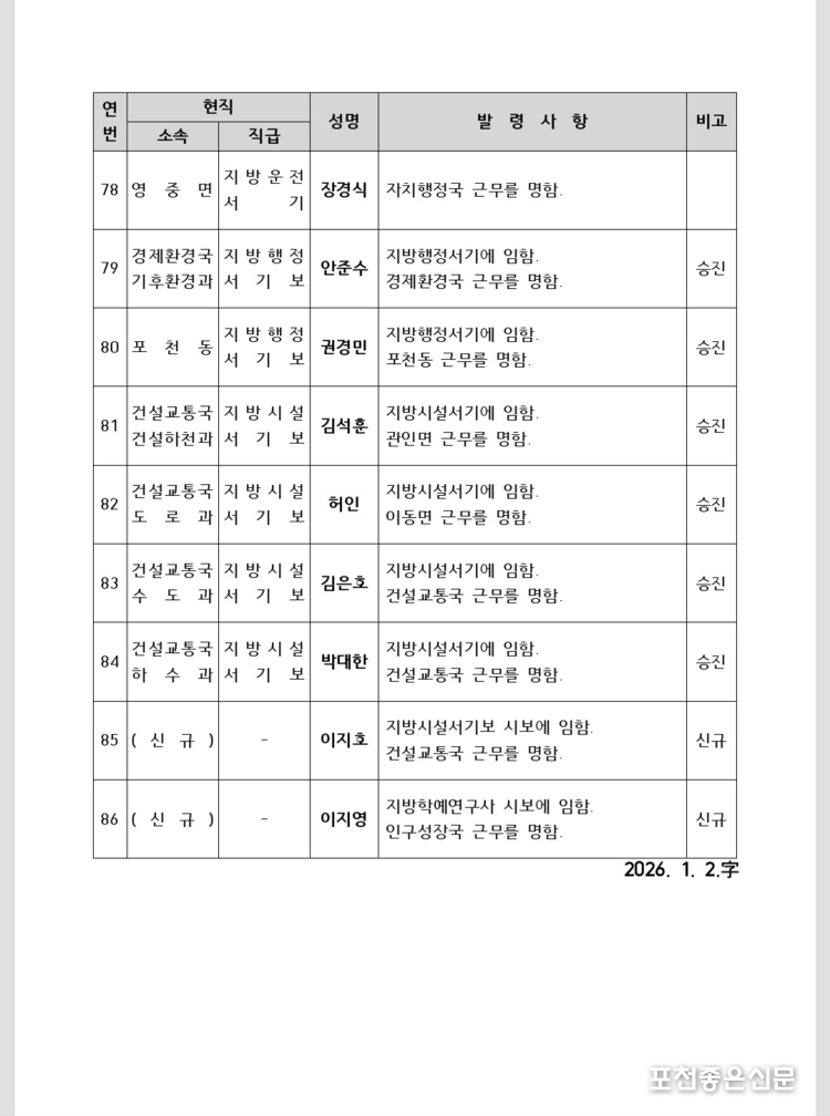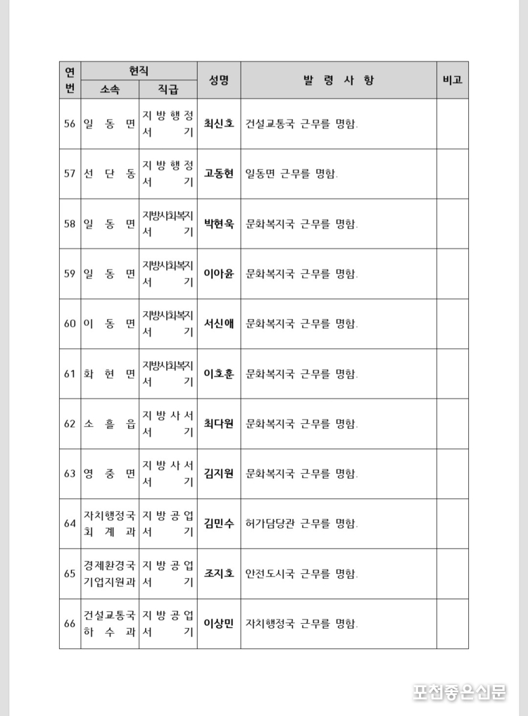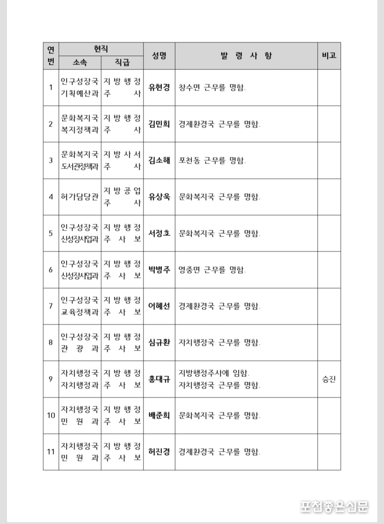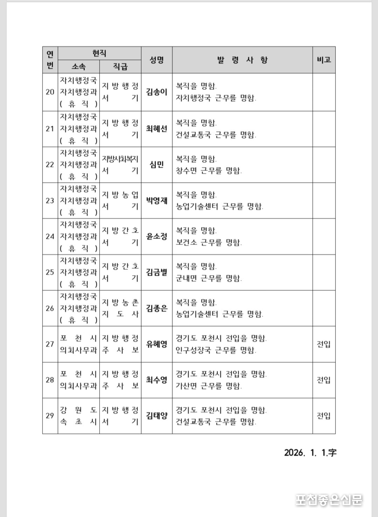 포천시는 12월 30일 1월 1일자 보직 인사발령을 발표하였다. 6급 33명, 7급 이하 86명 등 총 119명이 대상이다.