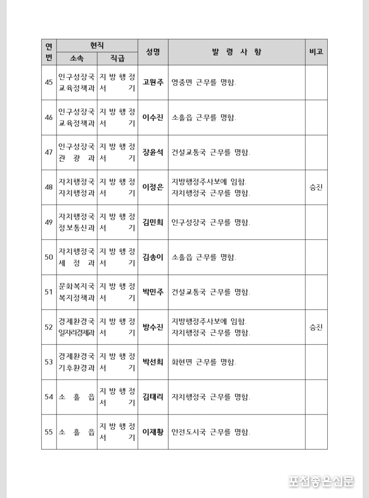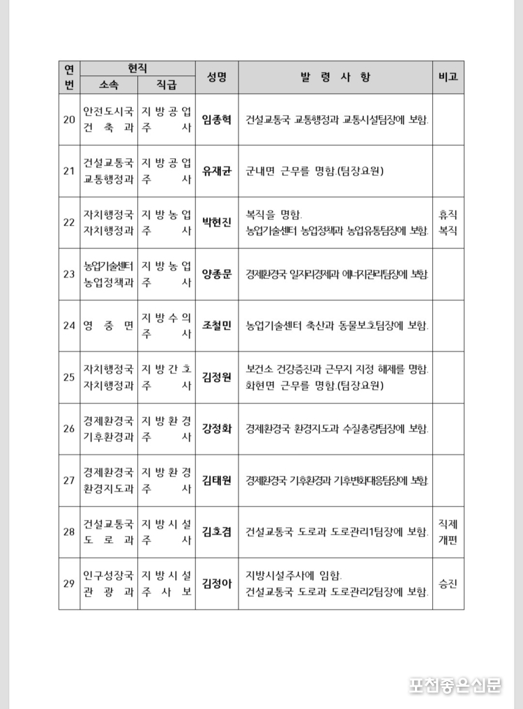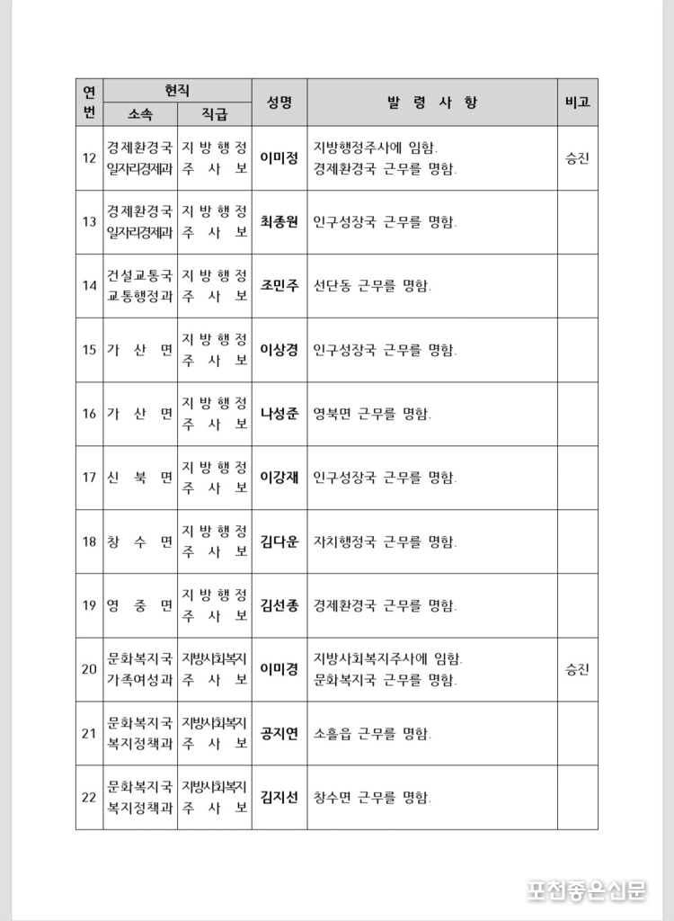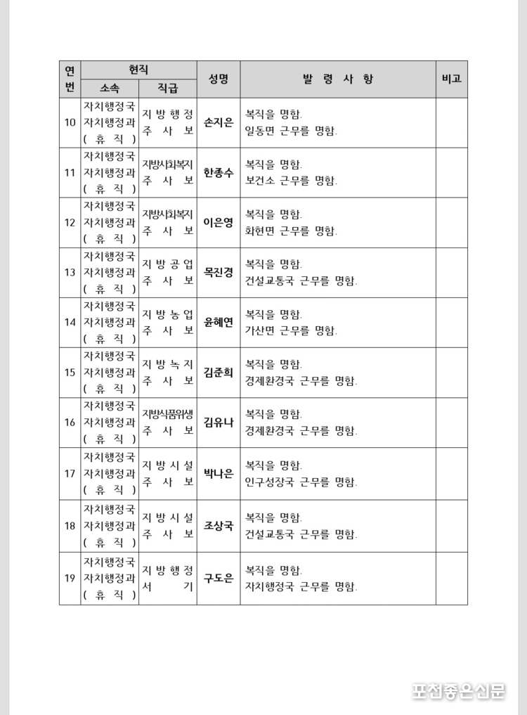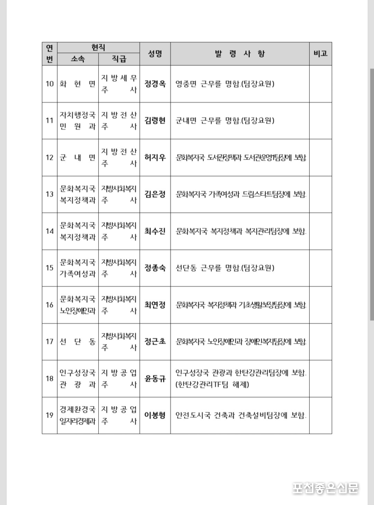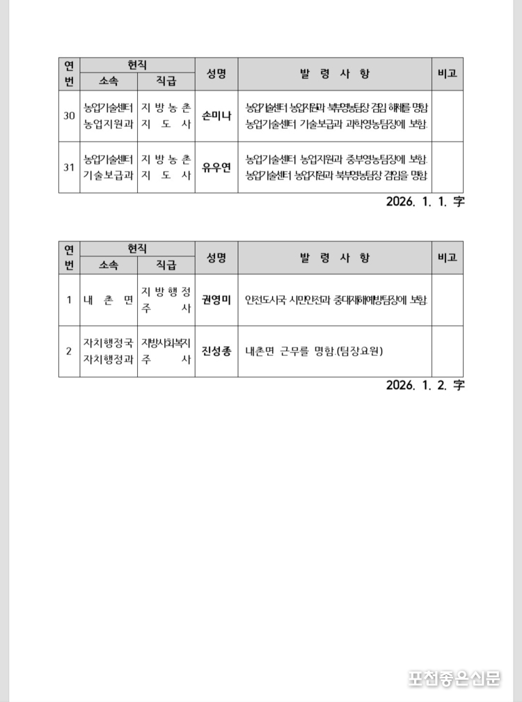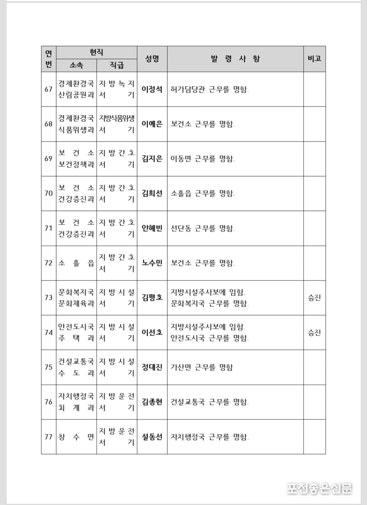 포천시는 12월 30일 1월 1일자 보직 인사발령을 발표하였다. 6급 33명, 7급 이하 86명 등 총 119명이 대상이다.