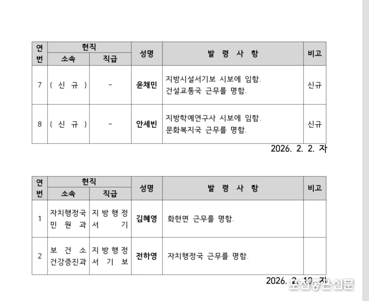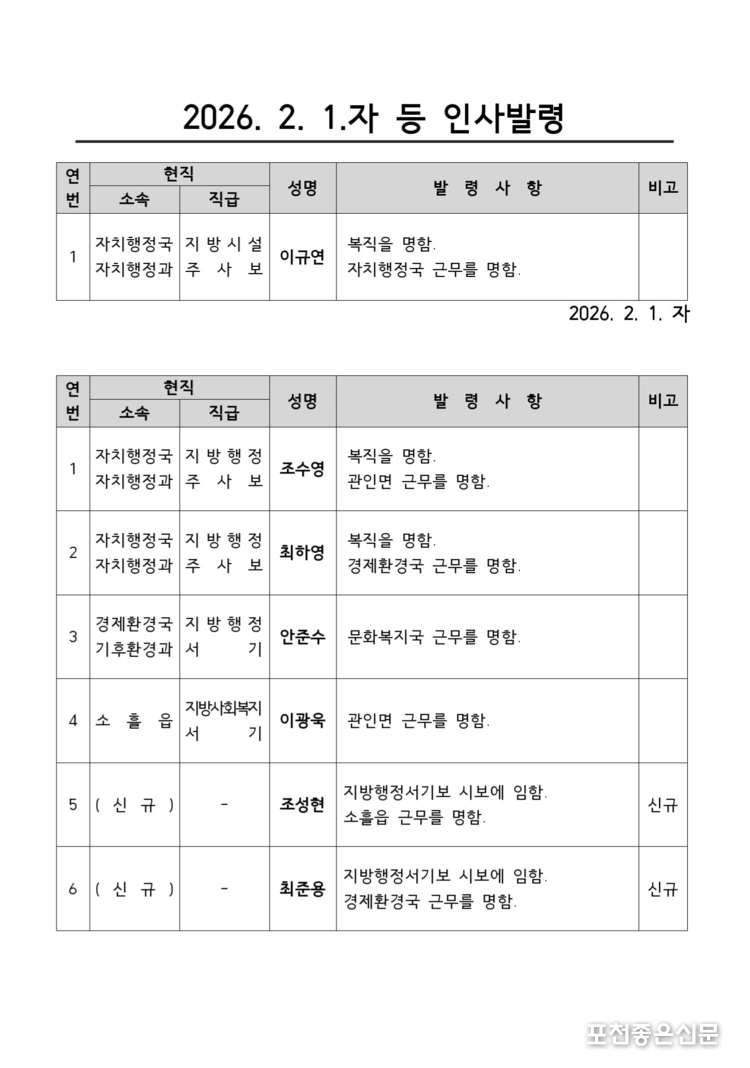 포천시는 1월 29일 7급이하 11명의 인사명령을 2월 1일 자 등으로 발표하였다.