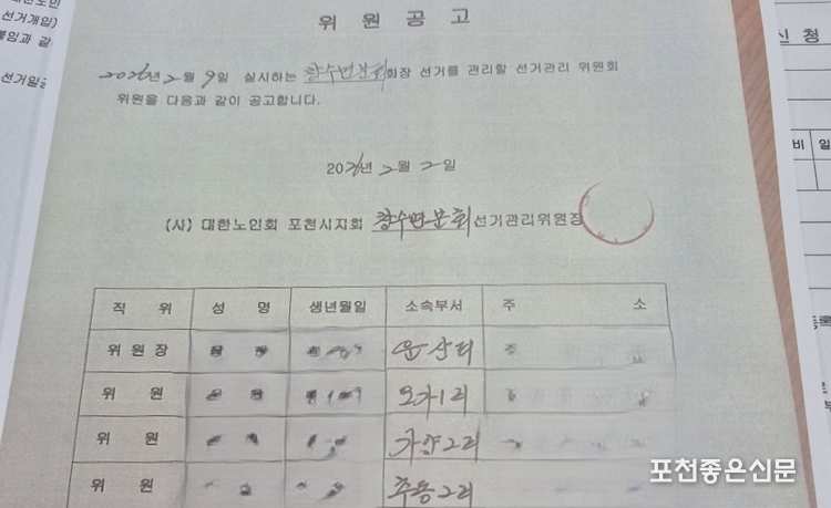 '대한노인회 포천시지부 창수면분회'는 지난 2월 2일, 2026년 분회장 선거를 위해 규정에 따라 위원장 포함 7인으로 '창수면분회 선거관리위원회'를 설치했다. 위원회는 선거 공고, 절차, 후보자 등록·제한·조건 등 전체적인 공정한 선거관리를 하는 조직이다.