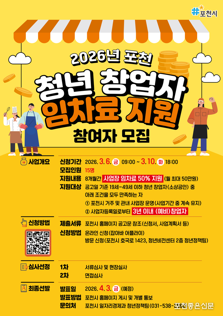 포천시는 청년 창업자의 안정적인 창업 환경 조성과 창업 지속 가능성 제고를 위해 「2026년 청년 창업자 임차료 지원사업」 참여자를 2026년 3월 6일부터 10일까지 모집한다고 2월 25일 밝혔다.