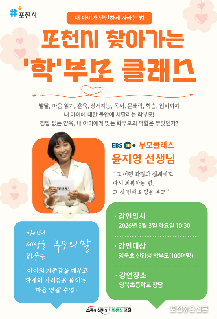 포천시 관계자는 “앞으로도 학부모 교육을 정례화하고 공공 학습 지원 체계를 지속적으로 강화해 모든 시민이 체감할 수 있는 ‘아이 키우기 좋은 도시 포천’을 구현하는 데 모든 행정력을 집중하겠다”고 강조했다.