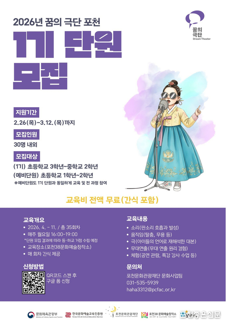 포천문화관광재단(대표이사 이중효)은 지역 아동·청소년을 위한 문화예술교육 프로그램 ‘2026 꿈의 극단 포천’의 1기 신규 단원을 오는 3월 12일까지 모집한다.