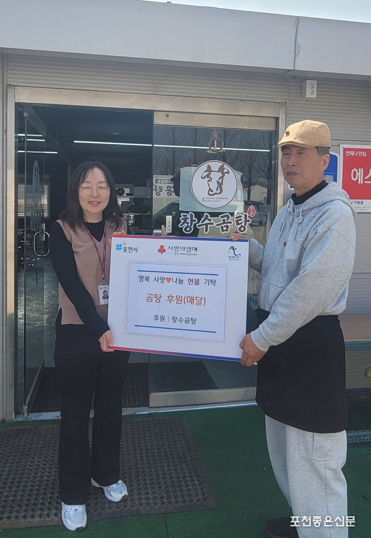 영북면 행정복지센터는 창수면에 소재한 창수곰탕(대표 곽용호)이 지난 3월26일 지역사회 나눔 실천의 일환으로 영북면 저소득 식사취약계층을 위해 매월 곰탕을 정기 후원하기로 했다고 밝혔다.
