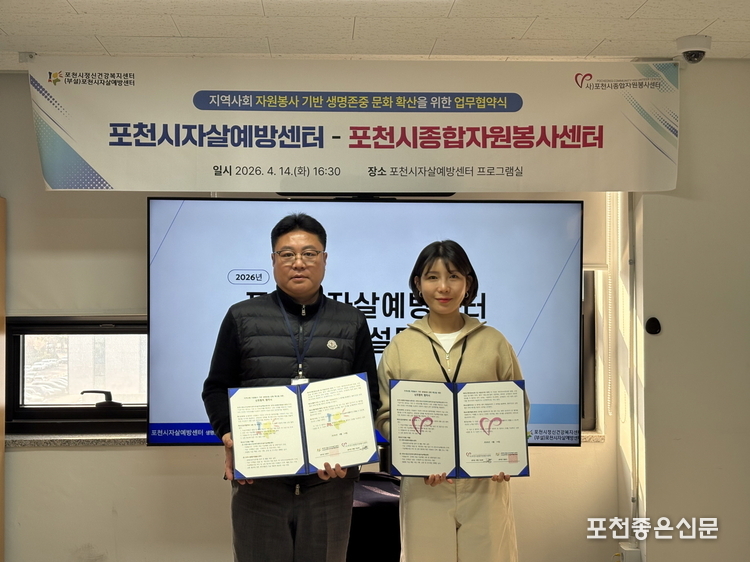 포천시자살예방센터(센터장 임종석)는 지난 4월 14일 포천시종합자원봉사센터(센터장 대행 석유화)와 함께 「2026년 지역기반 자살예방 협력체계 구축사업」의 일환으로 업무협약(MOU)을 체결했다. 협약은 자살 고위험군을 조기에 발견하고 지원하는 지역사회 대응 기반을 마련하기 위해 추진됐다.