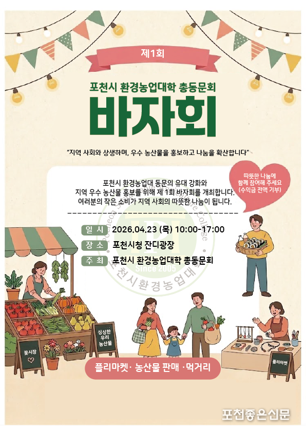 한편, 포천시 환경농업대학은 매년 전문 농업인력을 양성하며 지역 농업 발전의 중추적인 역할을 해오고 있으며, 총동문회는 이번 바자회를 기점으로 지역사회를 위한 다양한 공헌 활동을 이어갈 계획이다.